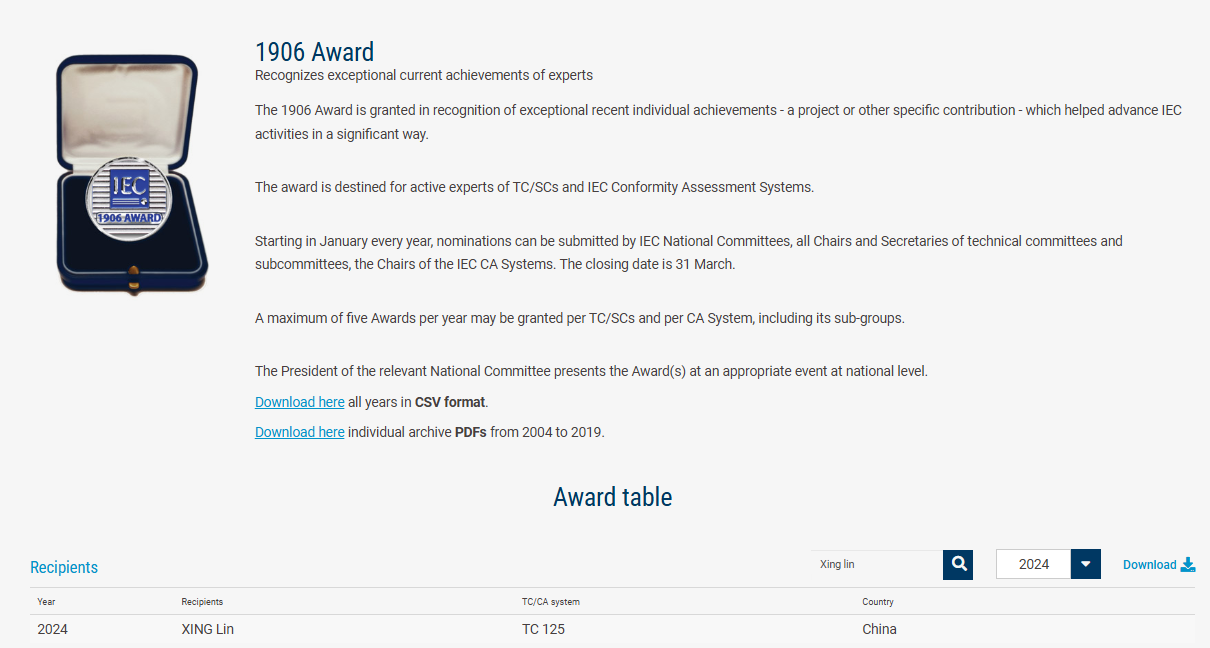 本次获2024年度的IEC1906奖是基于在该领域产品移动性能标准化研究与制订上实现了重大突破。