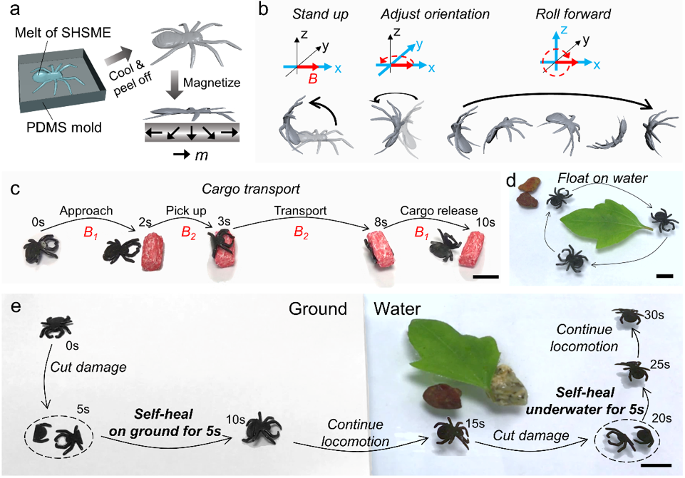 利用SHSME的热可重塑性设计构筑了软体水蜘蛛,磁控软体水蜘蛛不仅能够进行多种运动模式(站立、旋转、翻滚以及货物搬运),并且在陆地和水下遭到切割损坏后,都实现了即时(5s)的运动功能恢复,为两栖自愈合软体机器人提供了设计思路。