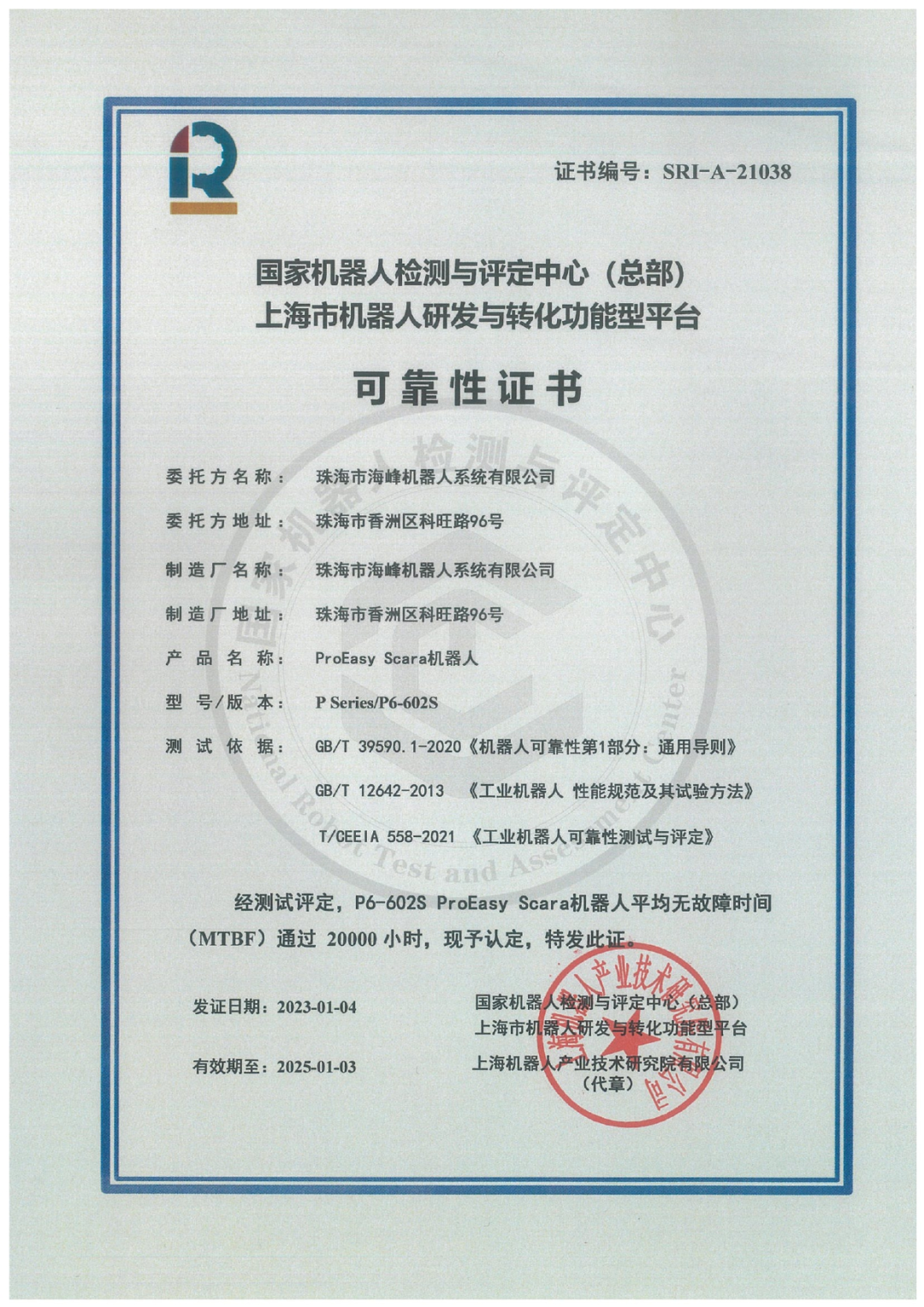 海峰机器人P6-602s 荣获MTBF 20000小时测评证书
