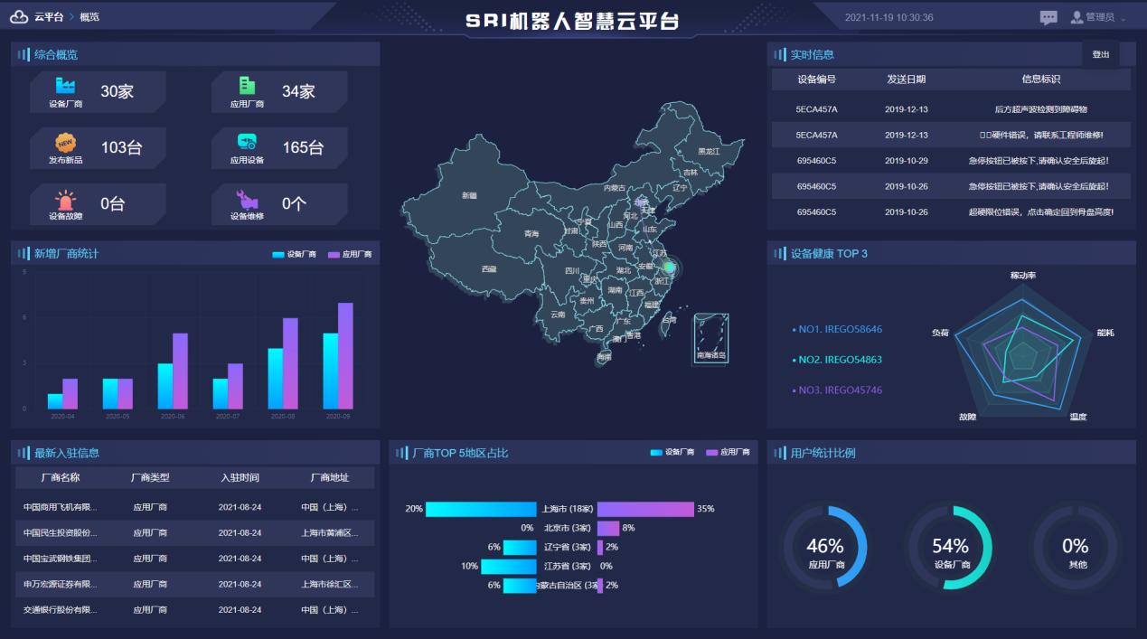 主要用于机器人设备的生产厂商和应用厂商对各自生产与使用的设备进行实时的监控、分析和管理。通过云技术打破线下管理作业的繁琐滞后等陈旧常规,实现机器人行业设备数据的实时共享与应用。具有如下功能: